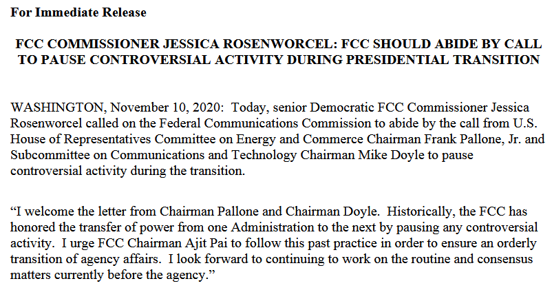 FCC: It wasn't supposed to end this way. FCC Chairwoman Jessica Rosenworcel was told two months ago by top Capitol Hill Republicans to put her pencil down and hit pause on controversial items during the transition to President Trump. Judging by the tough statement released Wednesday afternoon by FCC Commissioner Brendan Carr — just five days before Republican Carr becomes FCC Chairman — Rosenworcel decided to disregard that directive, even though it was the same one she proposed to Republican FCC Chairman Ajit Pai in 2020 after President Biden won (see screenshot below.) Carr's statement – which he said he released on his own because Rosenworcel refused to – complained that Rosenworcel "forced a vote on a partisan, uncoordinated, and counterproductive approach to the Salt Typhoon cybersecurity threats." He was troubled not just about timing but also substance. He said Rosenworcel's plan was not "a serious and effective response" to the worst cyber intrusion in our nation’s history. "Indeed, not one Member of Congress, nor one official in the intelligence community has encouraged me to vote in favor of this FCC action. In fact, I was told that this type of FCC regulatory action at this moment would be counterproductive and deter the productive collaboration that is necessary today," Carr said. Rosenworcel is expected to release more information today. “No decision has been made, so [Carr’s] statement is erroneous and premature," Jonathan S. Uriarte, Rosenworcel's Director of Strategic Communications/Policy Advisor, said in an email Wednesday night. Uriarte also passed along a statement from White House National Security Advisor Jake Sullivan, saying: “The FCC’s Declaratory Ruling and Notice of Proposed Rulemaking is a critical step to require U.S. telecoms to improve cybersecurity to meet today’s nation state threats, including those from China’s well-resourced and sophisticated offensive cyber program.”