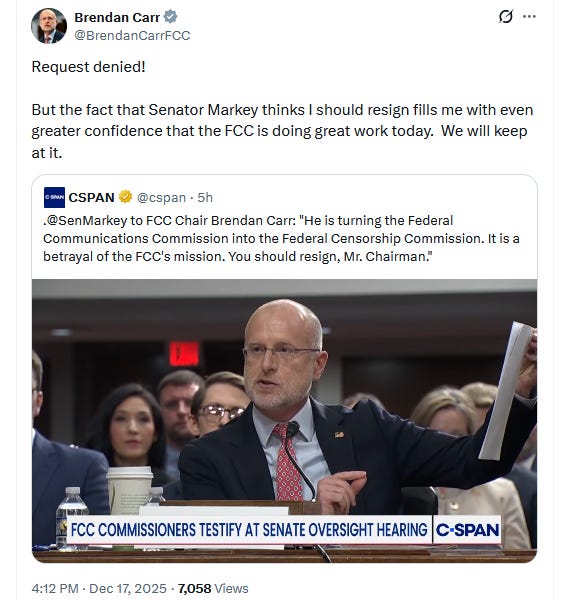 D.C. Memo: FCC Chairman Carr Was Ready for Senate Democrats' Partisan Gong Show Led by Markey