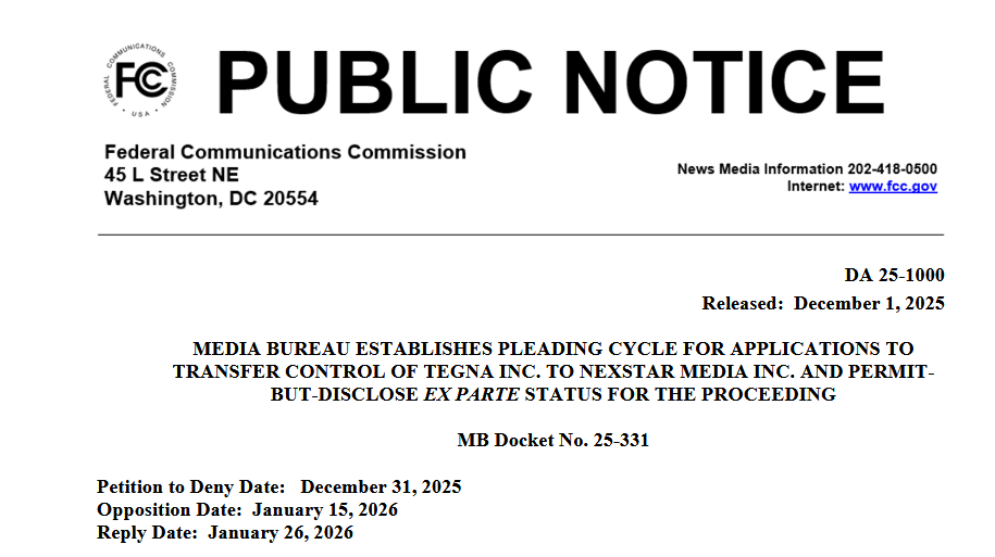 Merger: President Trump’s recent comments on FCC media ownership rules have apparently not slowed down the agency’s review of Nexstar Media Group’s $6.2 billion merger with TEGNA, a transaction that violates the FCC’s 39% cap on the household reach of a single TV station company nationally. In a Public Notice issued by the Media Bureau on Monday, the FCC said it had accepted for filing the Nexstar-TEGNA merger application in which Nexstar would take ownership of 64 TEGNA stations across the country. The TV stations filed the application on Nov. 18, 2025. Addressing the 39% cap issue, the FCC said, “The Applicants state that post-transaction, Nexstar would serve 54.5% of the national audience, and, therefore, seek a waiver of the National Television Multiple Ownership Rule.” Newsmax CEO Chris Ruddy, a Trump confidant, is fighting the merger for business and ideological reasons. He’s apparently won the support of Trump. On Nov. 23, Trump said on his Truth Social feed that he opposed elimination of the 39% cap “if this would also allow the Radical Left Networks to ‘enlarge…’ ABC & NBC, in particular, are a disaster - A VIRTUAL ARM OF THE DEMOCRAT PARTY.” Some have noted that by saying “if,” Trump did not totally rule out Nexstar-TEGNA; instead, Trump wanted to be sure the FCC would not allow ABC and NBC go on a TV station buying binge. (More after paywall.)