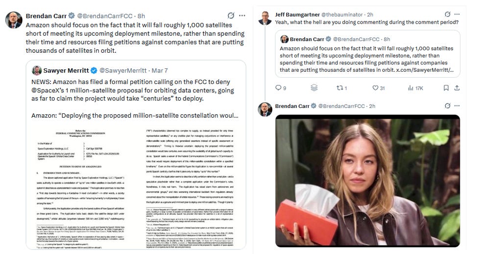 Space: This time, the package got dropped off at Amazon. Amazon caught the attention of FCC Chairman Brendan Carr on Wednesday … and not in a good way. The giant online retailer is fighting Elon Musk’s effort to gain FCC approval to deploy up to 1 million satellites that will act as solar-powered data centers to support AI and high-performance computing. In a March 6 filing with the FCC, Amazon described Musk’s plan as “a lofty ambition rather than a real plan – and a speculative placeholder rather than a complete application under the [FCC’s] rules.” Amazon added that Musk’s project “risks real harm,” pointing to concerns raised by “astronomers and environmental groups” and fears that Musk’s intent was the “monopolization of orbital resources.” That, apparently, was too much for Carr to take. “Amazon should focus on the fact that it will fall roughly 1,000 satellites short of meeting its upcoming deployment milestone, rather than spending their time and resources filing petitions against companies that are putting thousands of satellites in orbit,” Carr said on his X feed Wednesday. (More after paywall)