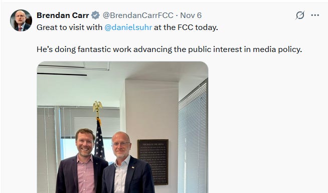 Merger: Charter Communications’ $34.5 billion merger with Cox Communications has the support of Daniel Suhr, President of the Center for American Rights, a Chicago-based organization with substantial clout with current FCC leadership. “Reviewing Charter’s recent record encourages us that this merger will serve the public interest given management’s track record of investing in all its American workers and all our American communities,” Suhr said in a six-page filing that the FCC received on Oct. 4 but did not post to its website until yesterday, probably because of the 43-day federal government shutdown. Suhr has the ear of FCC Chairman Brendan Carr on a number of policy issues. CAR’s broadcast TV news distortion complaint against 60 Minutes is still pending at the agency.