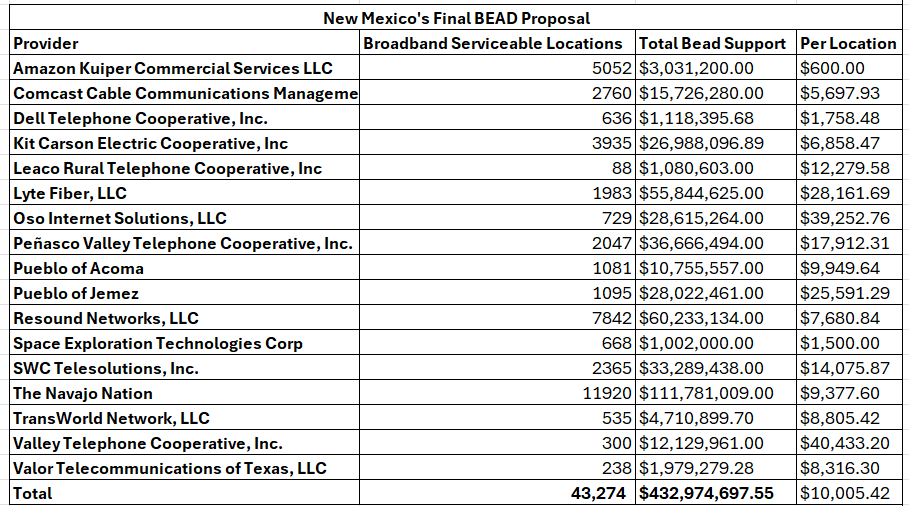 BEAD: New Mexico yesterday released its final $432.9 million BEAD plan for NTIA’s review − and some of the per-location costs are eye-popping. Valley Telephone Cooperative received $12.1 million to serve 300 locations at $40,433.20 per location. Oso Internet Solutions received $28.6 million to connect 729 locations at $39,252.76 per location. And how about Lyte Fiber getting $55.8 million for 1,983 locations at $28,161.69 per location? “Our BEAD program will close the digital divide and will ensure thousands of New Mexico families will soon receive high-speed broadband,” said Jeff Lopez, Director of the Office of Broadband Access and Expansion’s (OBAE). “Broadband is necessary for all families to receive critical services and information to stay connected and to succeed in our ever-changing world.” (More after paywall.)
