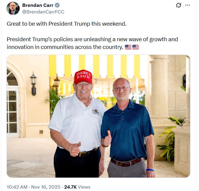 ▪️BREAKING: Sinclair Files with SEC to Buy E.W. Scripps▪️X Post of the Day: Trump, Carr Meet in Florida ▪️House Bill Would Remove LFAs from Cable TV Transfer Process▪️Financially Stressed HughesNet Looks to Sell Subs to Starlink▪️Penn. Lawmaker Concerned about Broadband Labor Costs▪️Disney Strips DEI from 2025 Annual Report to SEC▪️Charter Promotion: Take Four Mobile Lines, Get Free Broadband for Life▪️ CAGW Wants Spectrum Language Stripped from NDAA▪️ Policyband Opinion: Message to Trump White House − Pull the Plug on Biden’s BEAD Failure ASAP ▪️Trusty Defers on Legal Status of FCC