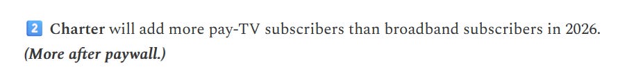 BREAKING: Stunning news out of Charter — the company said Friday morning it added video subscribers in the fourth quarter of 2025. “Total video customers increased by 44,000 in the fourth quarter of 2025, compared to a decline of 123,000 in the fourth quarter of 2024, with the improvement driven by new and simplified pricing and packaging launched in September 2024 and benefits from the inclusion of programmers’ streaming applications in Spectrum’s expanded basic packages,” the company said in a press release. Charter has 12.6 million total video customers. [On Thursday, Comcast reported losing 245,000 video subscribers in the fourth quarter.] Charter’s video gains seemed to validate CEO Chris Winfrey’s decision in September 2023 to require cable TV networks owned by media giants like Disney to provide their apps to Charter pay-TV subscribers for free. Charter’s video turnaround was a Policyband Top 10 prediction for 2026 as shown in this screenshot.