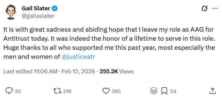 'They’ve basically decided to decapitate the Antitrust Division. It’s not just Slater. Her top deputies are gone,' said Douglas Farrar, a senior policy advisor to Democratic FTC Chair Lina Khan.