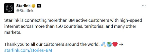 D.C. Memo: Starlink Rockets Past 8 Million Global Customers