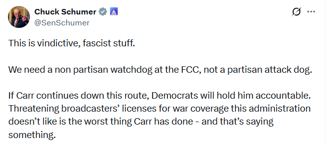 Left Rant: What exactly did FCC Chairman Brendan Carr say to trigger such outrage on the left? Over the course of the weekend, prominent Democrats engaged in a Fascist Fatwa aimed at Carr, though not surprisingly their real target wasn’t him but President Trump. Events move quickly. Trump – on Saturday, March 14 at 9:35 a.m. on Truth Social – lashed out at the New York Times and the Wall Street Journal. He called the outlets “Fake News Media” for overstating the damage Iran’s military strike did to five U.S. tanker planes parked at Prince Sultan air base in Saudi Arabia. “They are truly sick and demented people that have no idea the damage they cause the United States of America,” Trump said. Carr – on his X feed – posted a 167-word reaction (full version available here) to Trump. “Broadcasters that are running hoaxes and news distortions - also known as the fake news - have a chance now to correct course before their license renewals come up,” Carr said. “The law is clear. Broadcasters must operate in the public interest, and they will lose their licenses if they do not." (More after paywall)