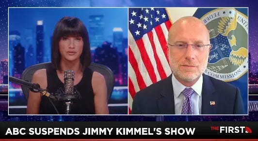 Jimmy: FCC Chairman Brendan Carr yesterday appeared on the Dana Show podcast to address the suspension of TV funnyman Jimmy Kimmel by employer Disney/ABC. The Dana Show is hosted by Dana Loesch, a right-of-center advocate known for her prominent and vocal support of gun rights. Here’s a partial transcript: