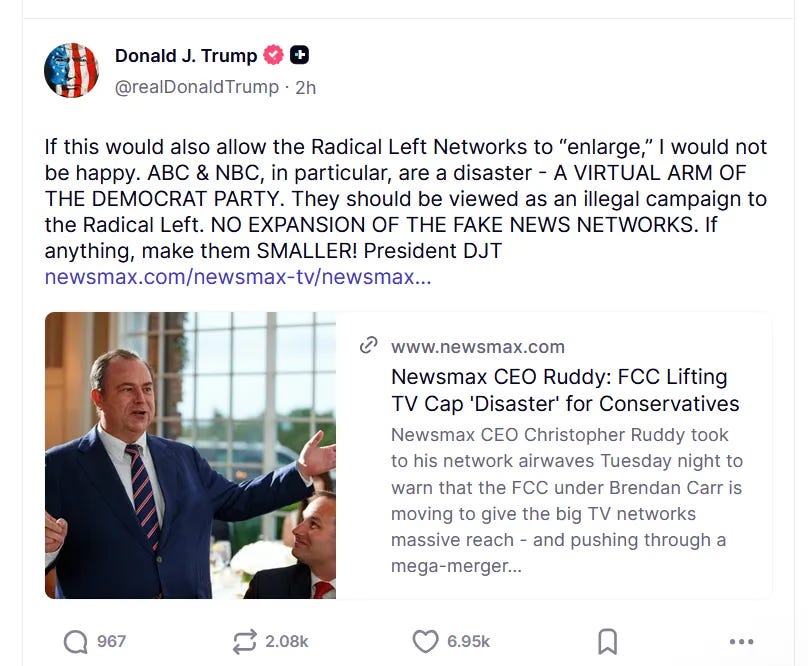 White House: President Trump signaled Sunday he would be concerned if new FCC broadcast ownership rules ended up enhancing the power of certain broadcast TV networks. But Trump’s concerns were certainly not the intent of FCC Chairman Brendan Carr. In his comments, Trump appeared to be taking the side of Newsmax CEO Chris Ruddy, who is fighting new FCC rules potentially in the works, claiming that they would be a “disaster” for conservatives. One America News Network (OAN) CEO Charles Herring is also backing Ruddy’s stance. In a Truth Social post, Trump specifically mentioned Disney-owned ABC and Comcast-owned NBC as potential beneficiaries of the FCC’s rules – something he did not want to see happen. “If this would also allow the Radical Left Networks to ‘enlarge,’ I would not be happy. ABC & NBC, in particular, are a disaster - A VIRTUAL ARM OF THE DEMOCRAT PARTY. They should be viewed as an illegal campaign to the Radical Left. NO EXPANSION OF THE FAKE NEWS NETWORKS. If anything, make them SMALLER! President DJT,” Trump said. Last Tuesday, in an Oval Office confrontation with ABC News reporter Mary Bruce, Trump referred to Disney/ABC as a “crappy company” whose network broadcasting license “should be taken away because you news is so fake” and said ‘our great” FCC Chairman Brendan Carr “should look at that.” Although ABC does not have an FCC license for the network, it does have FCC TV station licenses in eight markets. The debate is over the 39% cap, the limit on how many TV households a single broadcast company may reach. To the extent Trump is concerned about network station household growth, all Big Four networks have plenty of headroom right now. Under current FCC rules, NBC is at 20%, Fox at 26.2%, ABC at 20.1%, and CBS at 24.1%, according to BIA Advisory Services. Nexstar Media Group – which is at 39.1% − filed an application Nov. 18 with the FCC to merge with TEGNA, putting the combined TV station company at 56.4%, well over 39%. Nexstar has sought a waiver from the cap if it remains at a level that blocks the transaction from going forward. In response to press questions, Carr has said the effort to refresh the 39% cap docket was in part an attempt to empower licensed local TV stations to resist programming choices dictated by network executives in New York and Hollywood. (More after paywall.)
